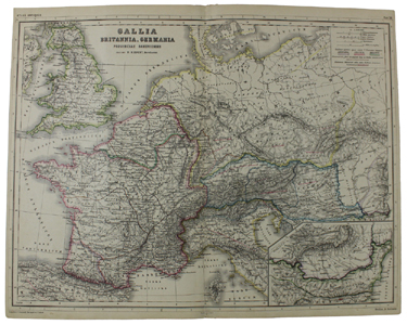 - Titolo: GALLIA, BRITANNIA, GERMANIA PROVINCIAE DANUVIENSES + DACIA. Atlas Antiquus - Large color map with hand watercolored borders & principal features