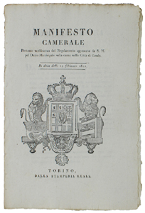 - Titolo: MANIFESTO CAMERALE Portante notificanza pel dazio municipale sulla carne nella città di CASALE. 12 febbraio 1821 [documento originale]