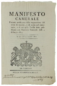 - Titolo: MANIFESTO CAMERALE Portante notificanza della soppressione dei diritti di transito, e di uscita pel numerario...21 settembre 1816 [documento originale]