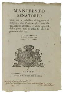 - Titolo: MANIFESTO SENATORIO con cui si notifica che l'infamia derivante da qualunque delitto... non si estende oltre la persona del reo. In data delli 18 giugno 1794 [documento originale]