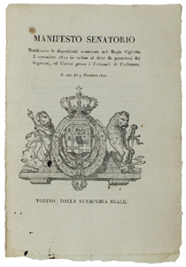 - Titolo: MANIFESTO SENATORIO Notificante li dritti da perceversi dai Segretarj ed Uscieri presso i Tribunali di Prefettura. 9 novembre 1822 [documento originale]