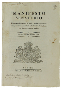 - Titolo: MANIFESTO SENATORIO riguardante il sequestro de' beni e redditi... posseduti in questi Stati da' sudditi di S.M.Siciliana ... In data degi 11 settembre 1798 [documento originale]