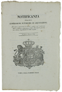 - Titolo: NOTIFICANZA DELLA REGIA COMMISSIONE SUPERIORE DI LIQUIDAZIONE colla quale si prescrivono le norme a seguirsi per l'esecuzione delle R.Patenti 21 giugno p.p. relative alle caducità generali ed al difetto … In data 21 Luglio 1824 [documento originale].