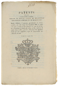 - Titolo: PATENTI colle quali S.E. il Signor Cavaliere THAON DI REVEL CONTE DI PRALUNGO Luogotenente Generale di S.M. ne' Regii Stati ... rende definitiva l'assegnazione di rendite ... e Fondi... In data del 21 giugno 1821 [documento originale]