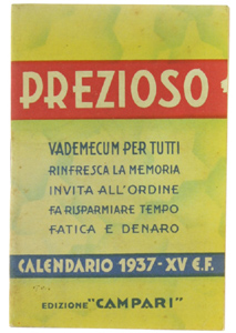 - Titolo: PREZIOSO - VADEMECUM PER TUTTI. Rinfresca la memoria - invita all'ordine - fa risparmiare tempo - fatica e denaro. Calendario 1937 - XV E.F.
