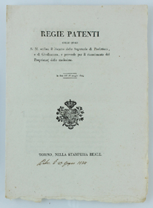 - Titolo: REGIE PATENTI colle quali S.M. ordina il riscatto delle Segreterie di Prefettura e di Giudicatura e provvede per il risarcimento dei Proprietarj delle medesime. In data del 18 maggio 1824 [documento originale].