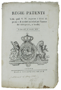 - Titolo: REGIE PATENTI Colle quali S.M. sopprime i diritti di premj e di nomine accordati per l'arresto dei delinquenti, e banditi ... In data delli 18 settembre 1818 [documento originale].