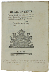 - Titolo: REGIE PATENTI relative all'obbligo di pagamento alle Regie Finanze. In data delli 14 agosto 1798 [documento originale]
