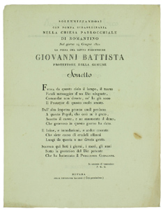 - Titolo: SOLENNIZZANDOSI CON POMPA STRAORDINARIA NELLA CHIESA PARROCCHIALE DI ROMANTINO nel giorno 24 Giugno 1821 La festa del Santo Precursore GIOVANNI BATTISTA protettore della Comune - SONETTO.